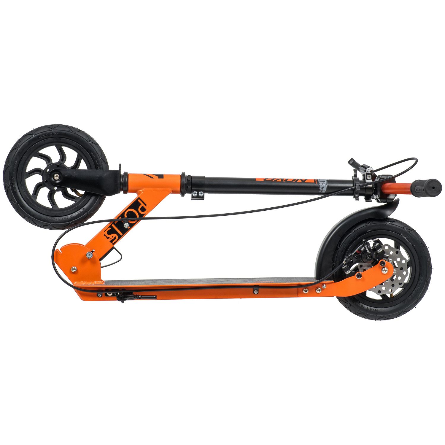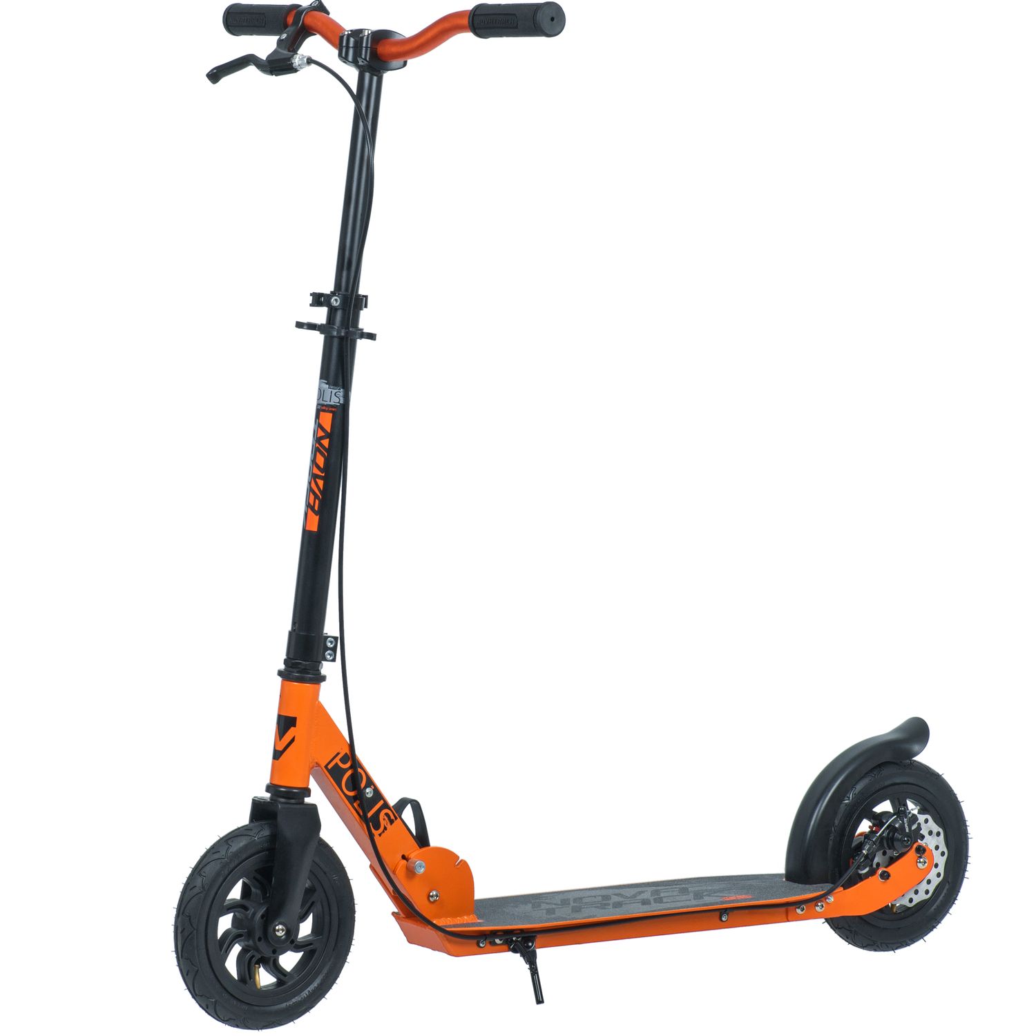 Novatrack Polis 200 Disc - надежный самокат на надувных колёсах размером 200 мм. Заниженная платформа с антискользящим покрытием способна выдерживать нагрузку до 100кг, позволяя активно и безопасно кататься как ребенку, так и взрослому. Система складывания самоката очень проста, безопасна и препятствует случайному открытию механизма во время езды. Самокат оснащен ручным дисковым тормозом.