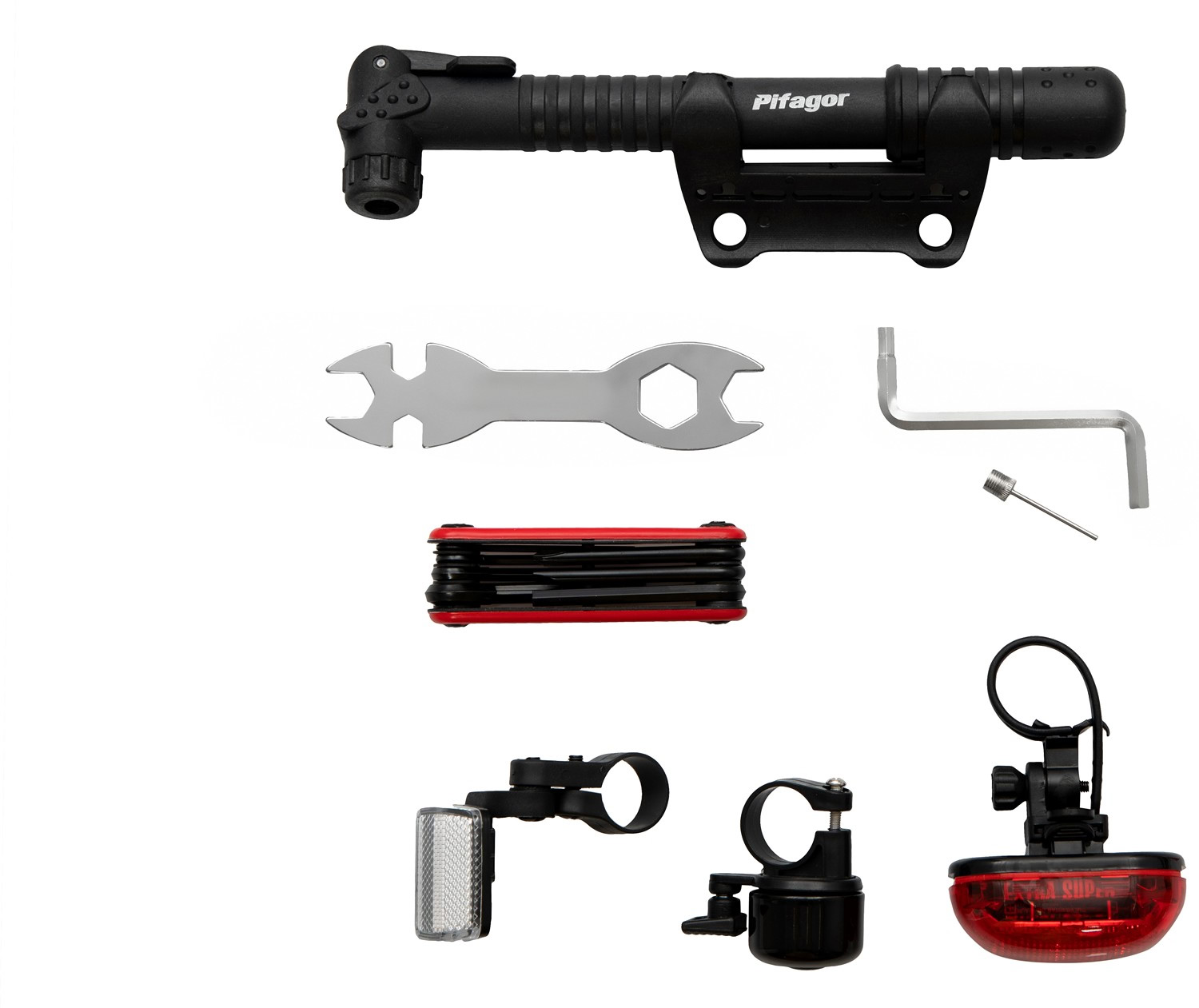 – Богатая комплектация: металлические крылья, насос, задний фонарик, звонок, инструменты для сборки и дополнительные колёса.