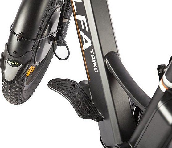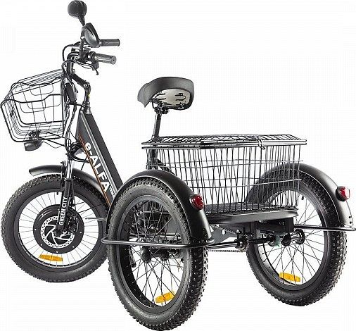 Электромотор прямого привода мощностью 500 Ватт расположен на переднем колесе и позволяет разгоняться до 25-30 км/ч. Литий-ионная аккумуляторная батарея (48V 10Ah) внутри рамы позволяет преодолевать расстояния до 40 км на одном заряде. Прочная стальная рама велотрицикла оснащена передней амортизационной вилкой, чтобы сделать езду по неровностям мягче и приятнее.
