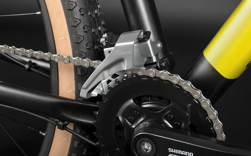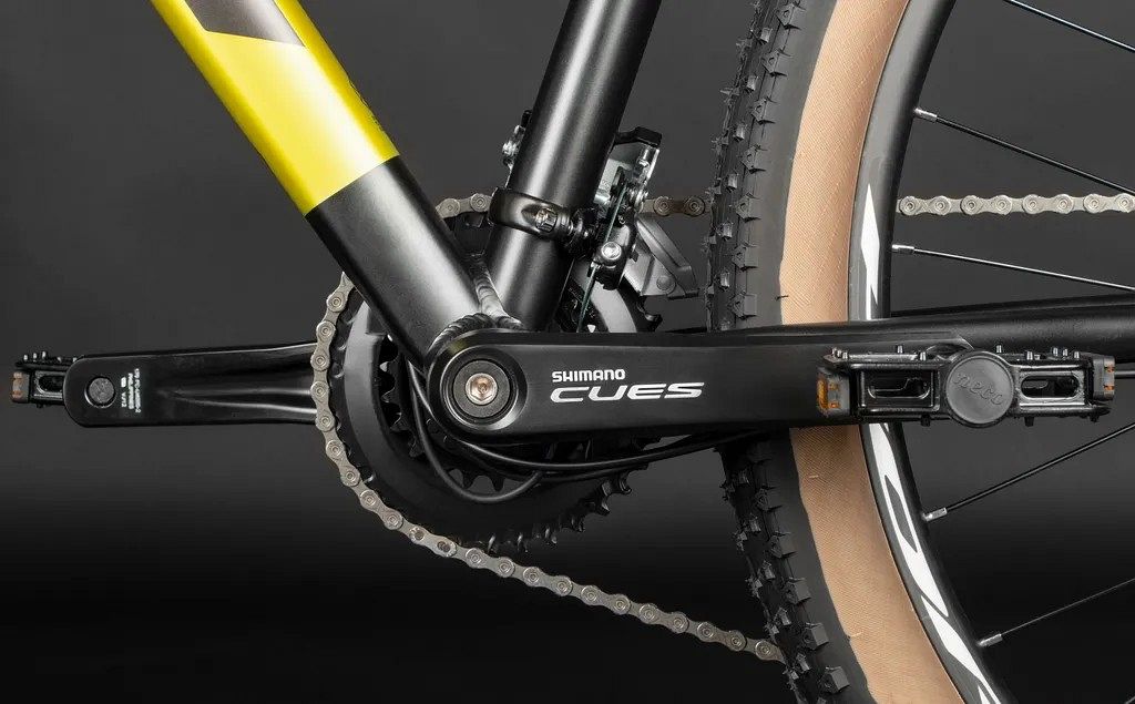 Велосипед оснащён 18-скоростной (2*9) трансмиссией Shimano Cues, которая выделяется среди прочих своей способностью очень чётко, но при этом плавно и без рывков переключать передачи. Шифтеры Shimano Cues предлагают удобную эргономику и оптический индикатор передач, что делает процесс переключения скоростей интуитивно понятным. Система Shimano Cues с градацией 22–36T и длиной шатуна 170 мм совместима с системой переключения передач LinkGlide, что гарантирует плавное и точное переключение.