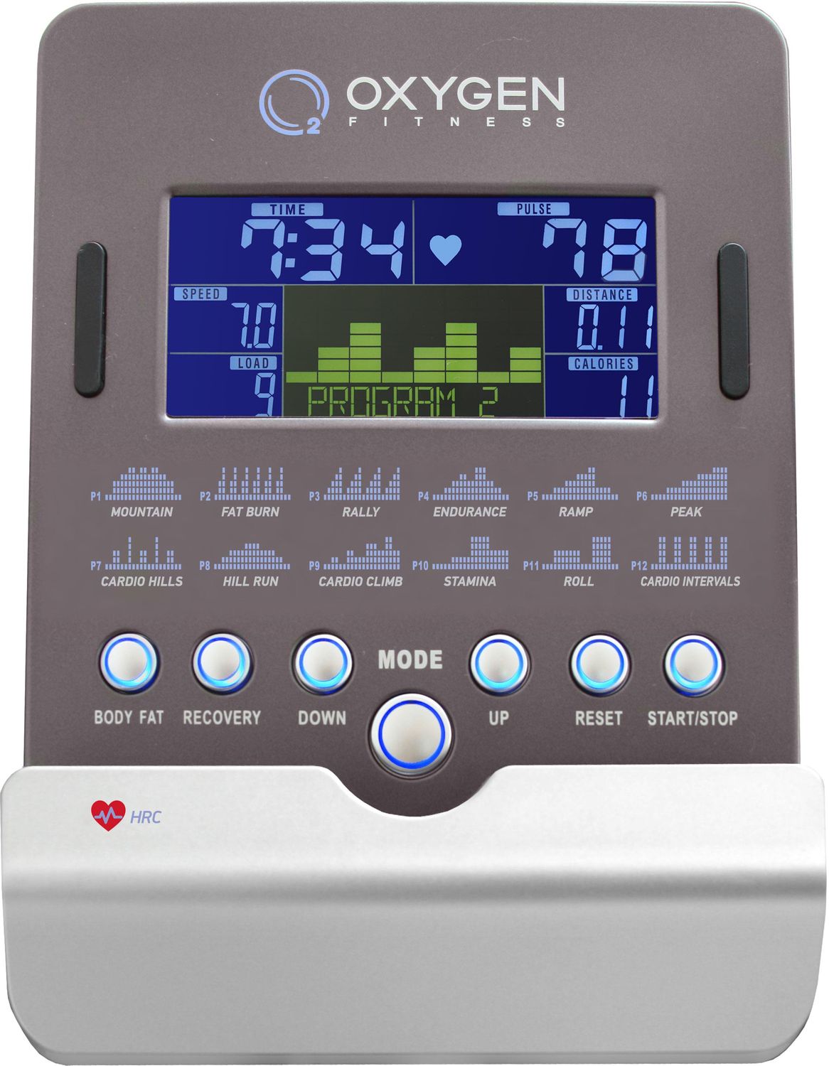 Показания консоли: профиль, время, дистанция, скорость, калории, обороты в мин., пульс, Ватты, фитнес-тест (Recovery), жироанализатор (Body Fat), индекс массы тела (BMI)