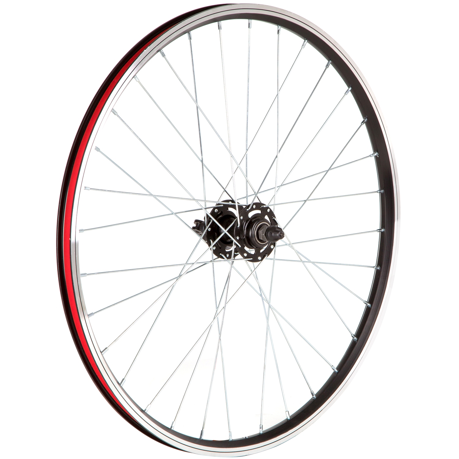 Переднее колесо 24 дюйма, двойной обод под v-brake на 32 спицы. Стальная втулка с промышленными подшипниками, крепление на эксцентрик.