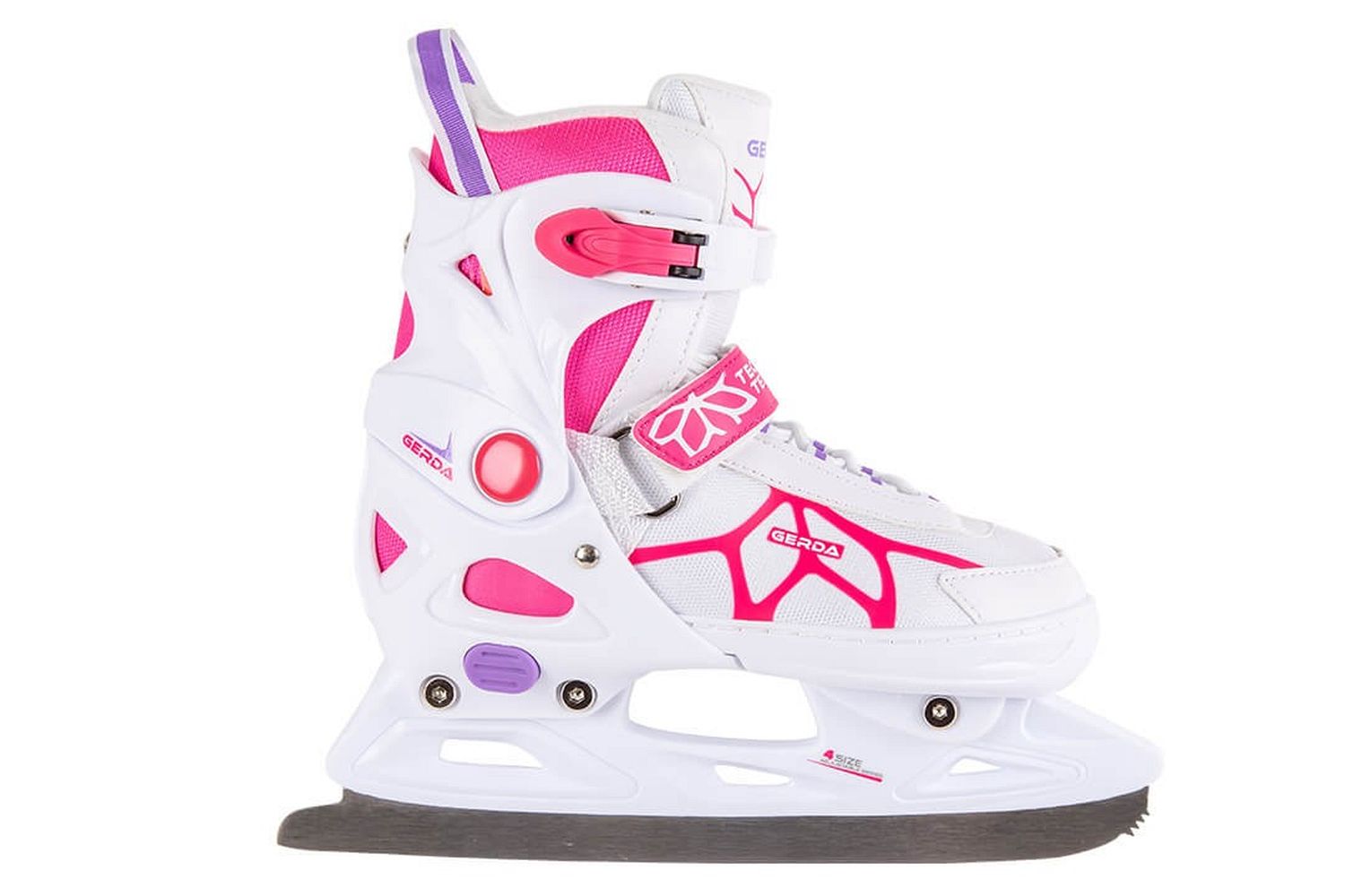 Красивые и практичные коньки для девочек с системой регулировки размера. Ботинок специальной конструкции позволяет увеличить размер в пределах 2-2,5 см, что позволяет адаптировать его к постоянно растущей ноге ребенка и комфортно кататься не один сезон.