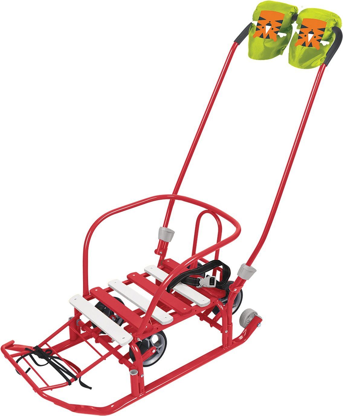 Металлические санки с механизмом выдвижных колесных шасси со складной родительской ручкой-толкателем для катания и перевозки детей.