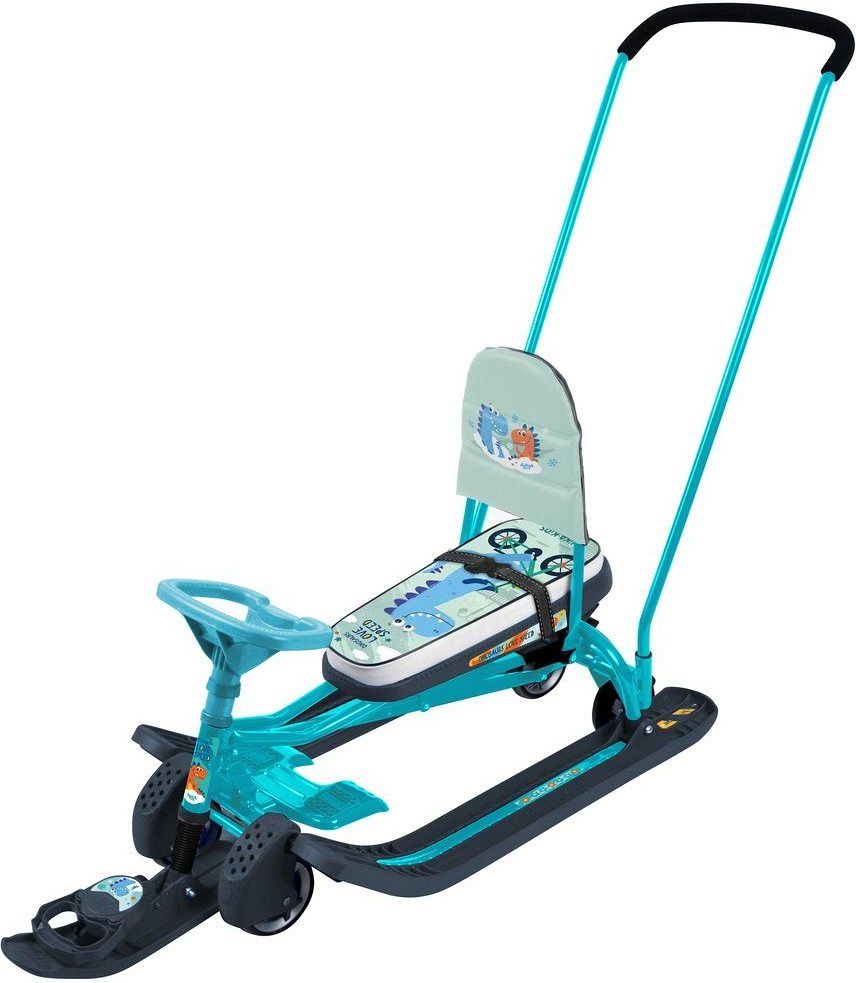 Снегокат НИКА Тимка спорт 6 (ТС6/Д, с динозавром), с механизмом выдвижных шасси и родительской ручкой-толкателем для прогулок с детьми от 4 до 7 лет. Модель 2 в 1: колеса и полозья позволяют свободно передвигать снегокат по любой дороге.
